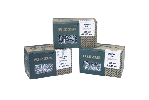Саморез ПШС Rizzel - с напрессованой шайбой имеют широкую плоскую головку под крестовидную биту (PH2), которая одновременно выполняет роль шайбы. Наконечник оцинкованный - сверло.